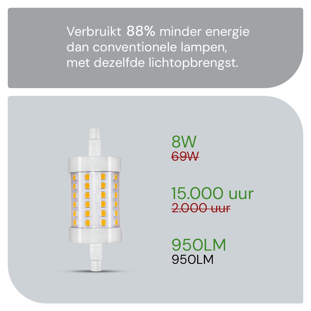 De SPL R7s LED Lamp is ontworpen met energie-efficiëntie in gedachten. Met een verbruik van slechts 8W biedt deze lamp een krachtige lichtopbrengst van 950 lumen, wat zorgt voor een heldere verlichting zonder onnodig hoge energiekosten.