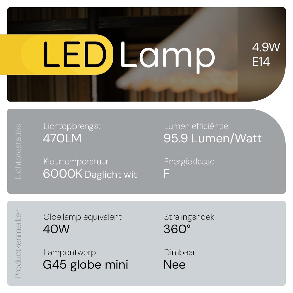 Technik E14 LED Lamp 4.9W – 470lm – 6000K – Daglicht Wit – LED Globe Mini P45 – Vervangt 40W Halogeen Gloeilamp – 5 stuks