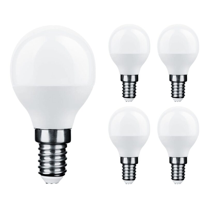 De Technik E14 LED Lamp 6W is een energiezuinige lichtbron die ontworpen is om traditionele 45W gloeilampen te vervangen. Deze LED kogellamp, met een G45 vorm, biedt een helder daglicht wit licht van 6000K, wat ideaal is voor ruimtes waar helder en natuurlijk licht gewenst is. De verpakking bevat vijf stuks, waardoor het een praktische keuze is voor meerdere armaturen in huis of op kantoor.