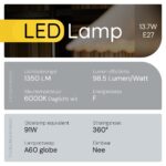 Technik E27 LED Lamp 13.7W – 1350lm – 6000K – Daglicht Wit – LED Globe A60 – Vervangt 91W Halogeen Gloeilamp – 5 stuks