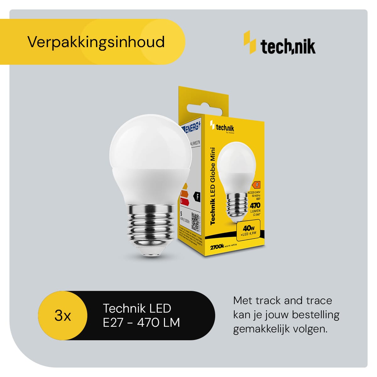 - Hoeveel lampen zitten er in een verpakking? De verpakking bevat 3 stuks Technik E27 LED Lampen.