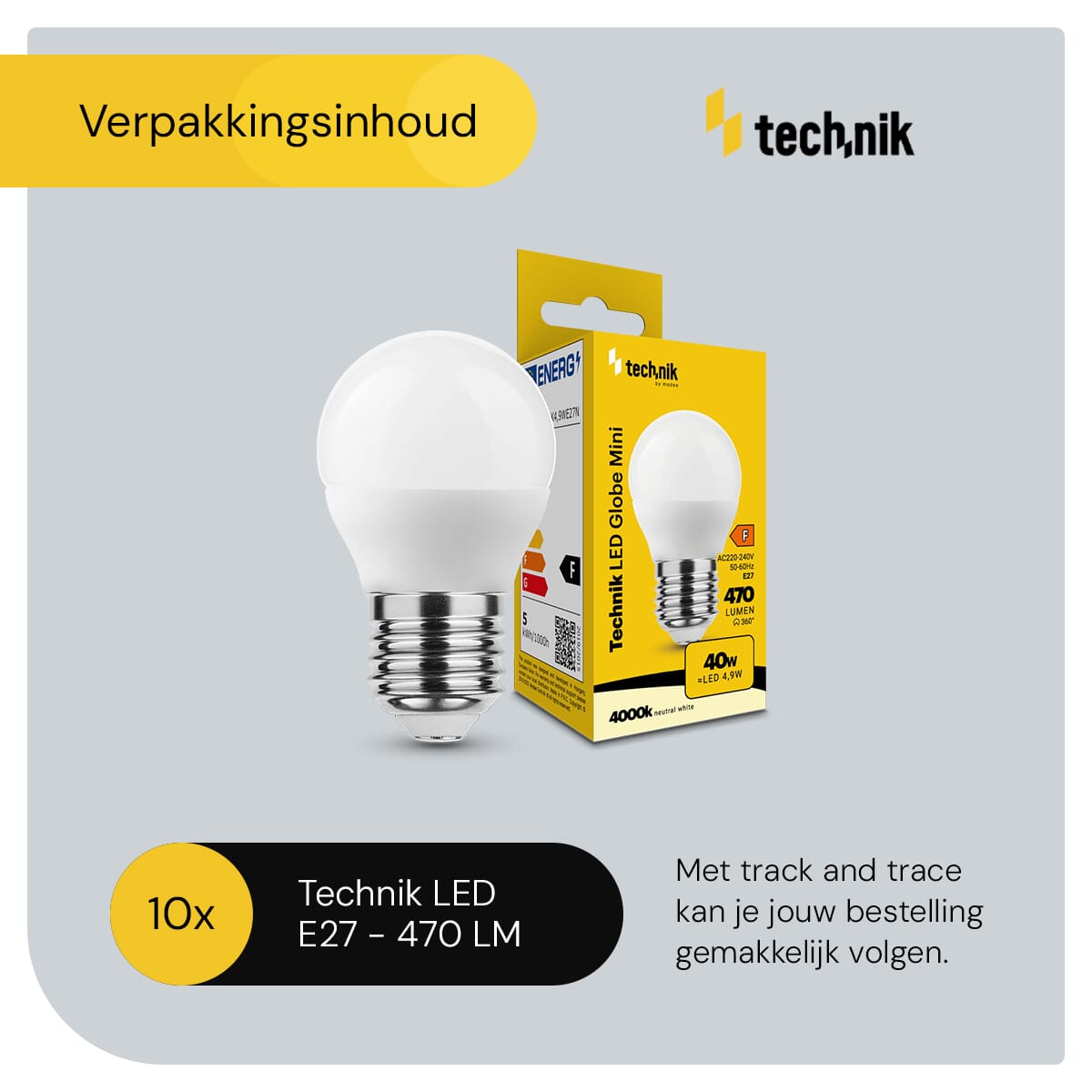 Technik E27 LED Lamp 4.9W – 470lm – 4000K – Neutraal Wit – LED Globe Mini P45 – Vervangt 40W Halogeen Gloeilamp – 10 stuks