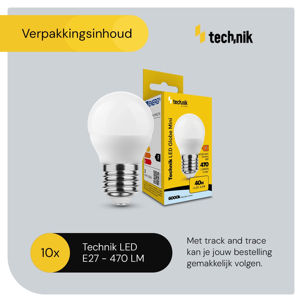Technik E27 LED Lamp 4.9W – 470lm – 6000K – Daglicht Wit – LED Globe Mini P45 – Vervangt 40W Halogeen Gloeilamp – 10 stuks