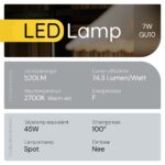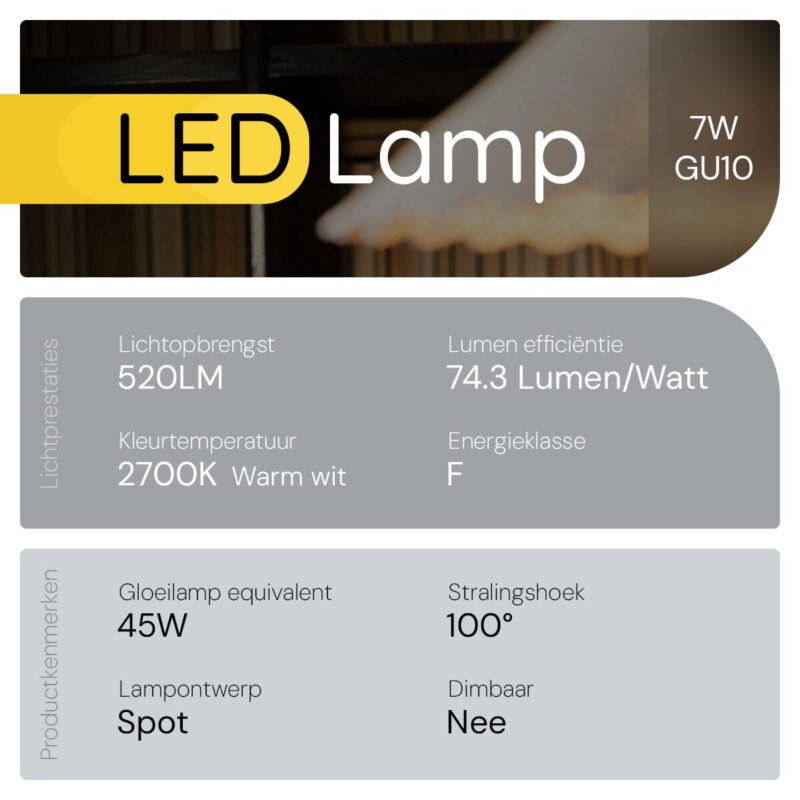 - Energiezuinig: Verbruikt slechts 7W en vervangt een 45W halogeenlamp.