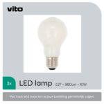 De VITO LED Filament Lamp A60 E27 is een energiezuinige lichtbron die de klassieke uitstraling van een gloeilamp combineert met de moderne efficiëntie van LED-technologie. Deze lamp is ontworpen om een warme, gezellige sfeer te creëren in woonkamers, restaurants of vintage armaturen. Met een vermogen van 10W vervangt deze lamp traditionele 75W gloeilampen, wat resulteert in aanzienlijke energiebesparingen.