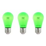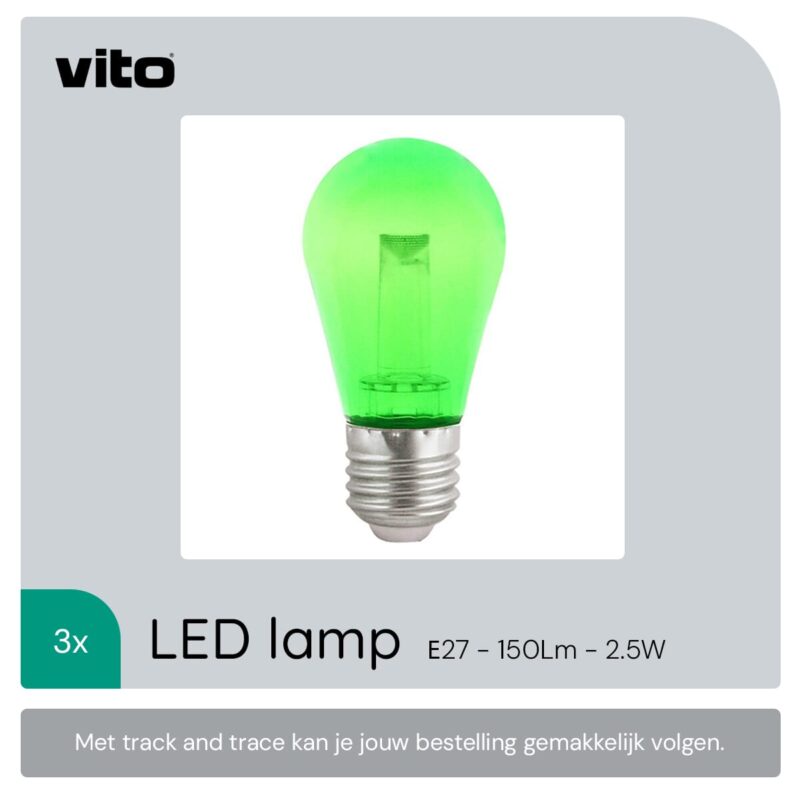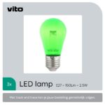 De VITO LED Lamp G45 E27 is een energiezuinige lichtbron die ontworpen is om traditionele 18W lampen te vervangen. Met een vermogen van slechts 2.5W biedt deze lamp een lichtopbrengst van 150 lumen. De lamp straalt groen licht uit, wat het ideaal maakt voor feestverlichting, tuinverlichting of gebruik in de horeca. Deze lampen worden geleverd in een set van drie stuks.