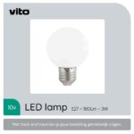 De VITO LED Lamp G45 E27 verbruikt slechts 3W, wat aanzienlijk minder is dan traditionele gloeilampen. Dit maakt de lamp niet alleen energiezuinig, maar ook kosteneffectief op de lange termijn. De lamp heeft een lange levensduur, waardoor vervanging minder vaak nodig is.