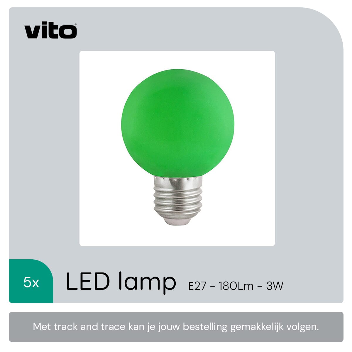 De VITO LED Lamp G45 E27 is een energiezuinige lichtbron die ontworpen is voor diverse toepassingen zoals feestverlichting, tuinverlichting of gebruik in de horeca. Deze lamp vervangt traditionele 20W lampen en biedt een groen licht met een helderheid van 180 lumen. De lamp is geschikt voor een spanning van 180-240V en wordt geleverd in een set van 5 stuks.