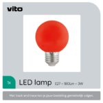De VITO LED Lamp G45 E27 is een energiezuinige lichtbron die ontworpen is om traditionele 20W lampen te vervangen. Met een vermogen van slechts 3W biedt deze lamp een lichtopbrengst van 180 lumen in een opvallende rode kleur. Deze lamp is ideaal voor feestverlichting, tuindecoratie of gebruik in de horeca, waar sfeerverlichting gewenst is.