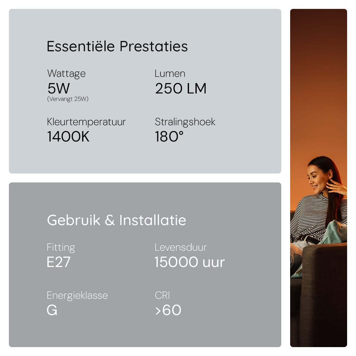 Deze lamp is geschikt voor diverse toepassingen, waaronder wandlampen, lantaarns en restaurantverlichting. Het warme amberkleurige licht van 1400K zorgt voor een aangename sfeer in elke omgeving.