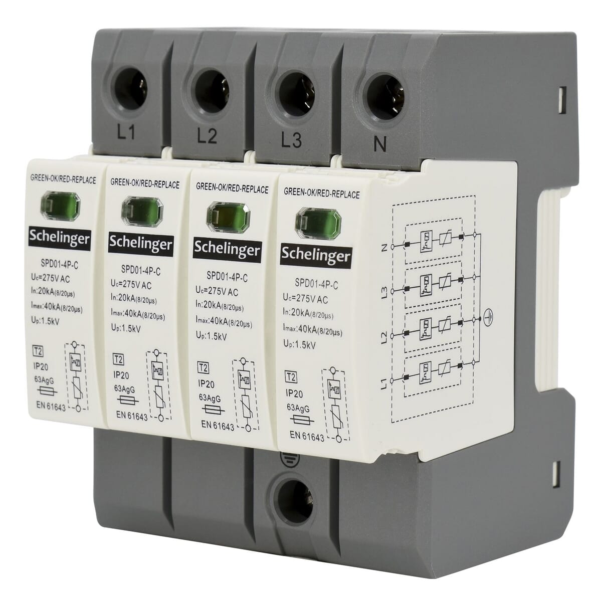 Deze 4-polige overspanningsbeveiliging (SPD) van Schelinger beschermt jouw elektrische installatie tegen piekspanningen veroorzaakt door indirecte blikseminslag en schakelpieken. Dankzij de hoge ontlaadstroom van 20kA en het lage beveiligingsniveau <1,5kV is dit een betrouwbare keuze voor woningen, bedrijfspanden en industriële installaties. Voorzien van DIN-rail montage en groene/rode statusindicator.
