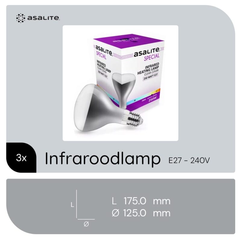 De Asalite Infrarood Warmtelamp met helder glas is ontworpen voor directe warmteafgifte in diverse omgevingen. Deze lamp is geschikt voor gebruik in badkamers, werkplaatsen, sauna’s en dierenverblijven. Met een vermogen van 250W en een kleurtemperatuur van 2800K biedt deze infrarood spotlamp efficiënte verwarming.