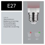 Met zijn E27 fitting en een diameter van 95 mm is deze warmtelamp eenvoudig te installeren in standaard armaturen. Het is geschikt voor gebruik in verschillende omgevingen, van badkamers tot terrariums en wellnesscentra.