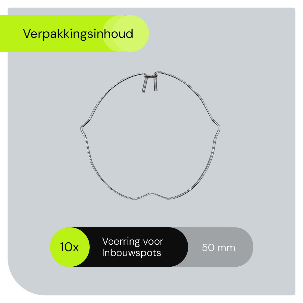 2. Hoeveel veerringen zitten er in een verpakking? Een verpakking bevat 10 stuks Veerringen. Dit is voldoende voor het installeren van meerdere inbouwspots.
