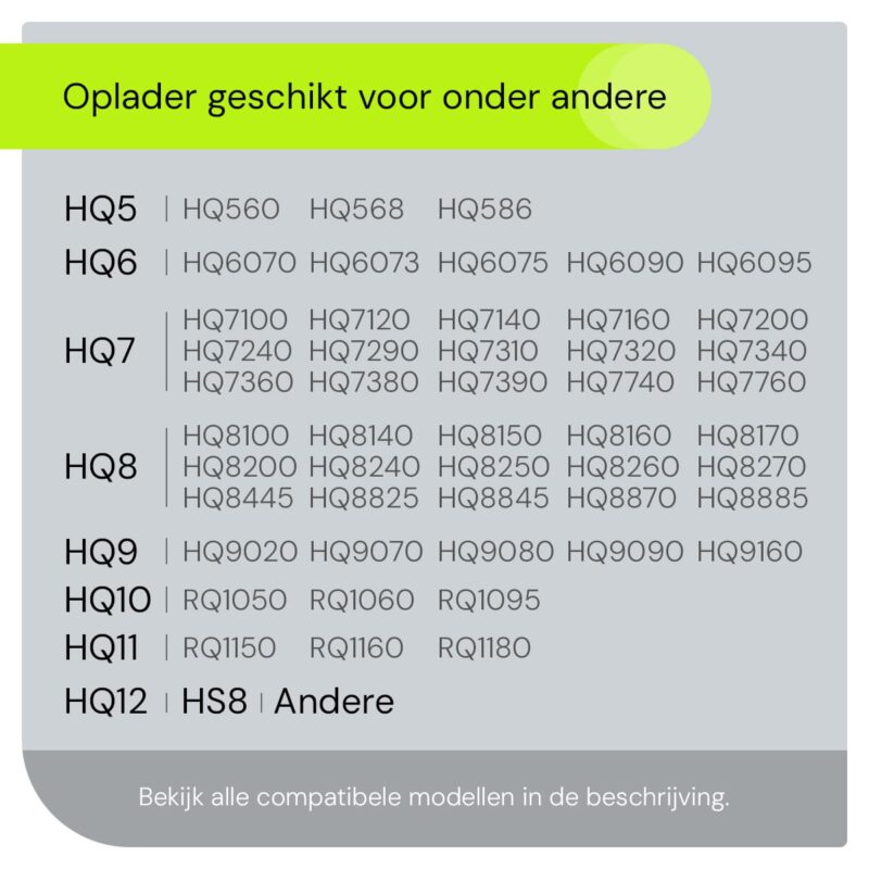 - Universele compatibiliteit: Geschikt voor een breed scala aan Philips scheerapparaten, waardoor je nooit meer hoeft te zoeken naar de juiste oplader.