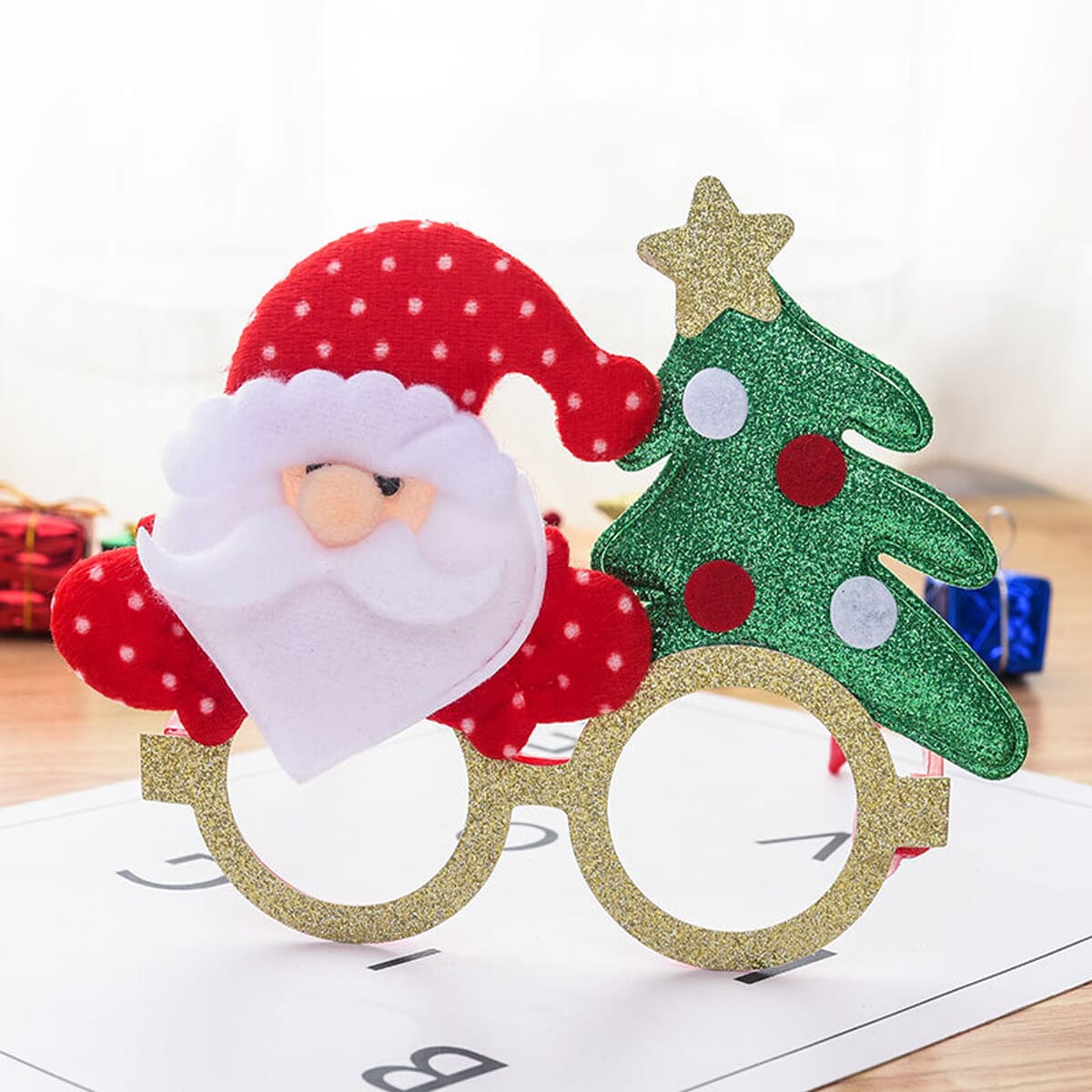 De feestelijke kerstbril werkt als een standaard bril, maar met een decoratief ontwerp dat bovenop het montuur is bevestigd. Je zet de bril eenvoudig op je neus, en het ontwerp blijft stevig op zijn plaats, waardoor je direct een feestelijke uitstraling krijgt.