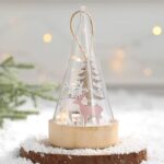 De glazen kerst stolp is een decoratief item dat perfect is voor het creëren van een feestelijke sfeer in huis. Deze stolp, met een afmeting van 12.5×6.2cm, bevat een charmant tafereel van herten en bomen, wat een winterse uitstraling geeft. Het product is voorzien van verlichting die werkt op een meegeleverde batterij, waardoor het een sfeervol licht verspreidt.
