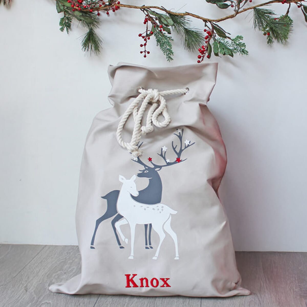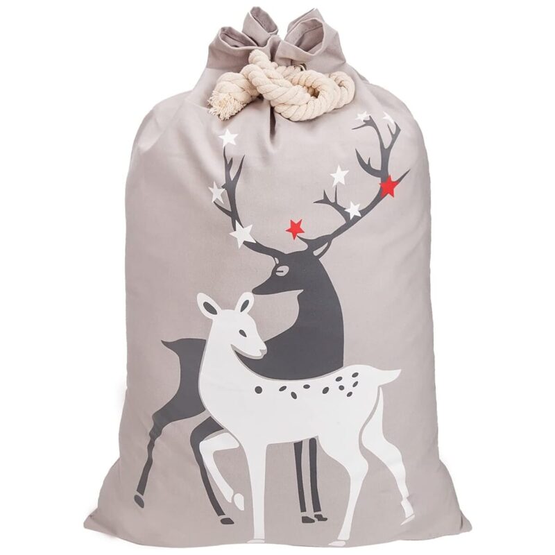 De grijze kerstzak in kerstman-stijl is een praktische en feestelijke oplossing voor het verpakken van grote cadeaus tijdens de feestdagen.
