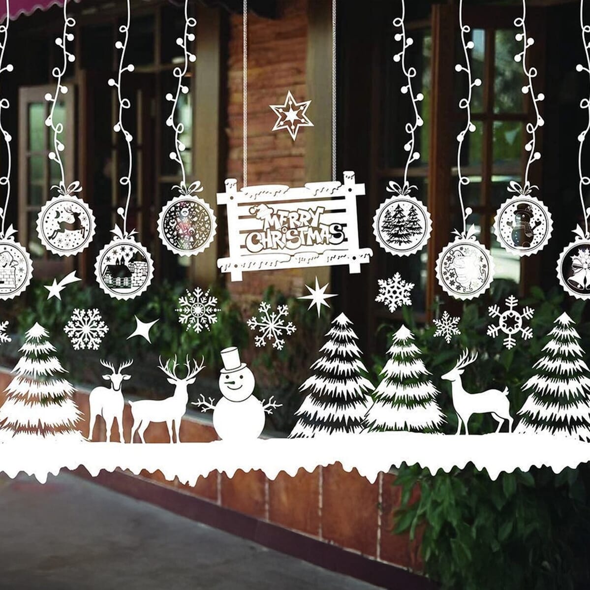 Kerst Raamstickers – Winterlandschap met Kerstballen, Sneeuw en Sneeuwpop