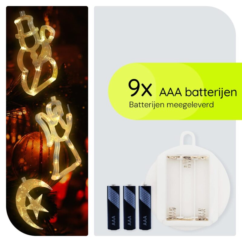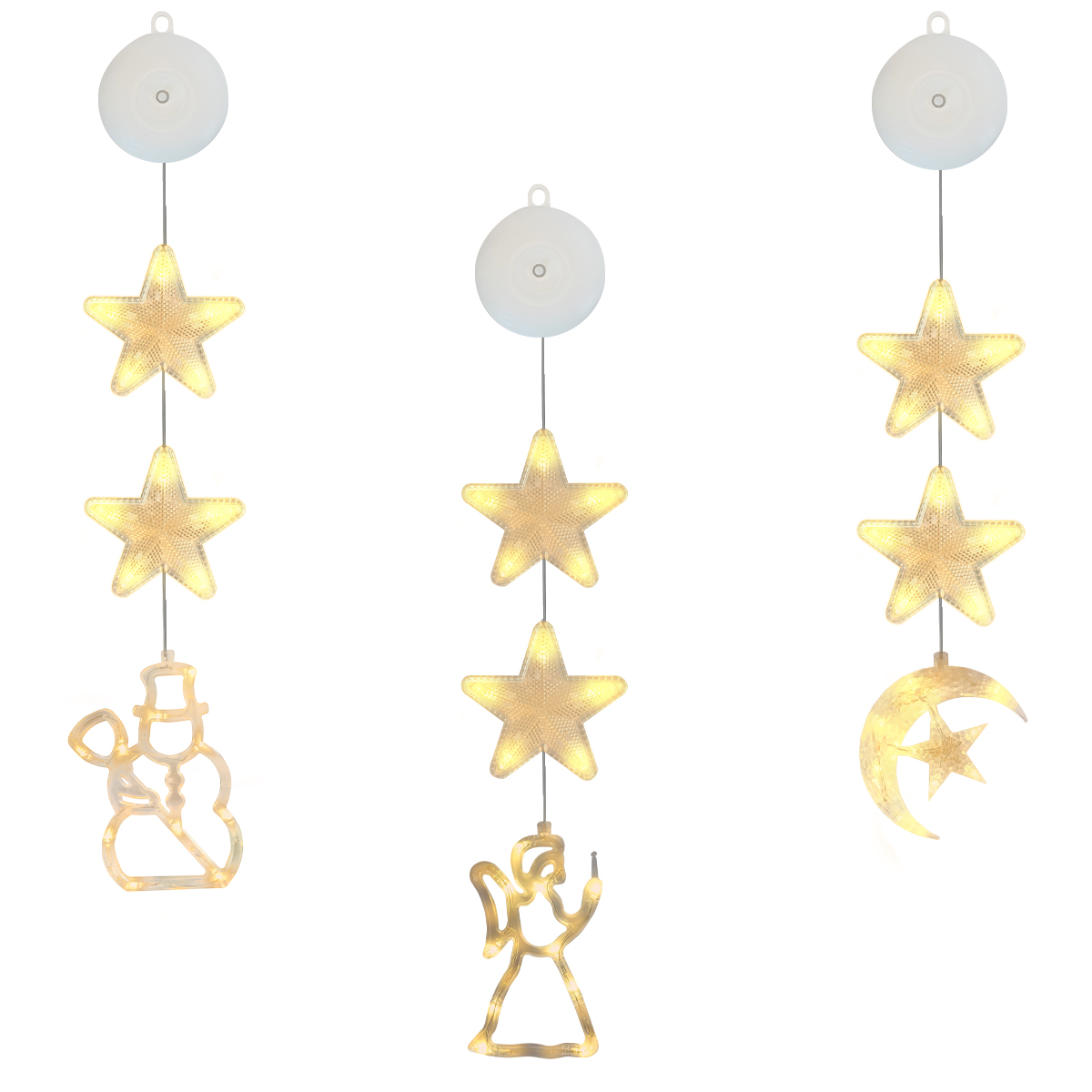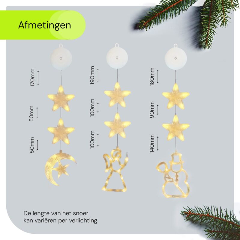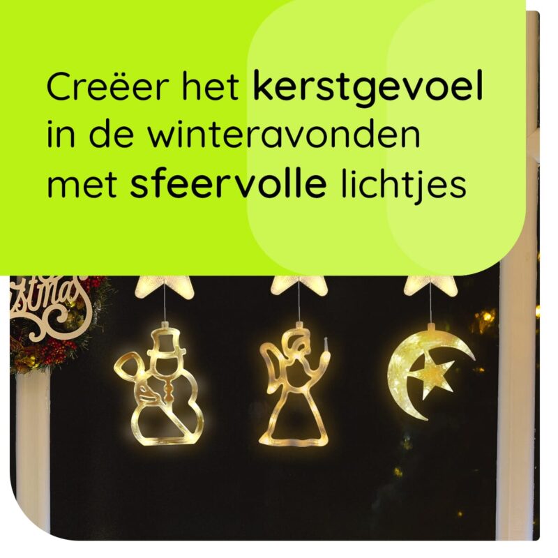 Kerstverlichting set voor het raam met engel, halve maan en sneeuwpop