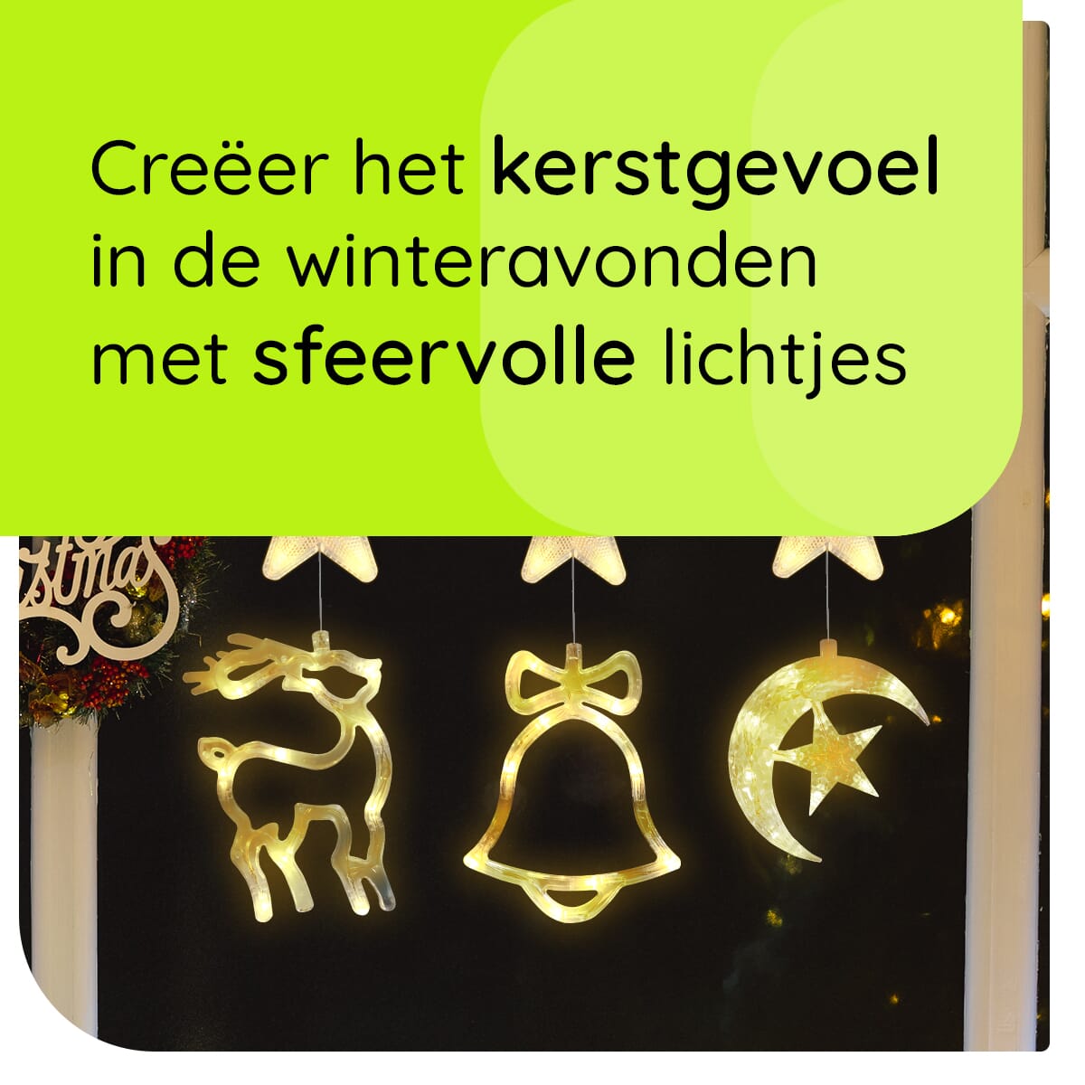 Kerstverlichting set voor het raam met halve maan, kerstbel en rendier