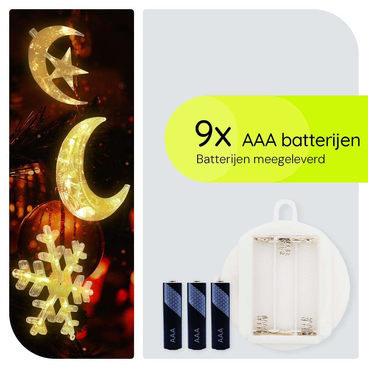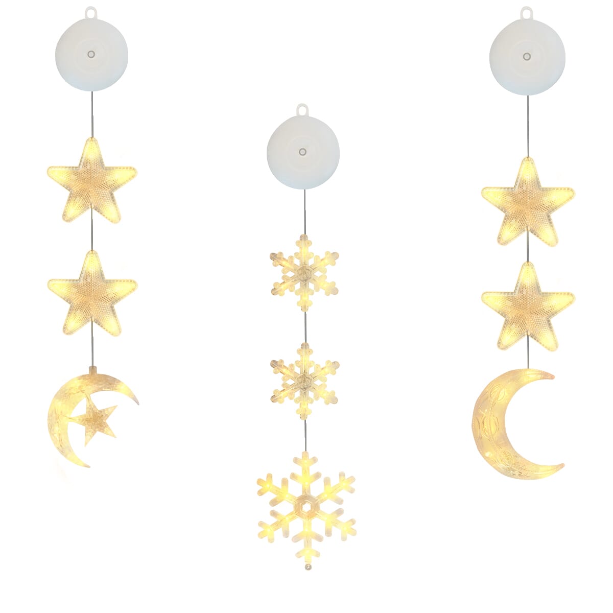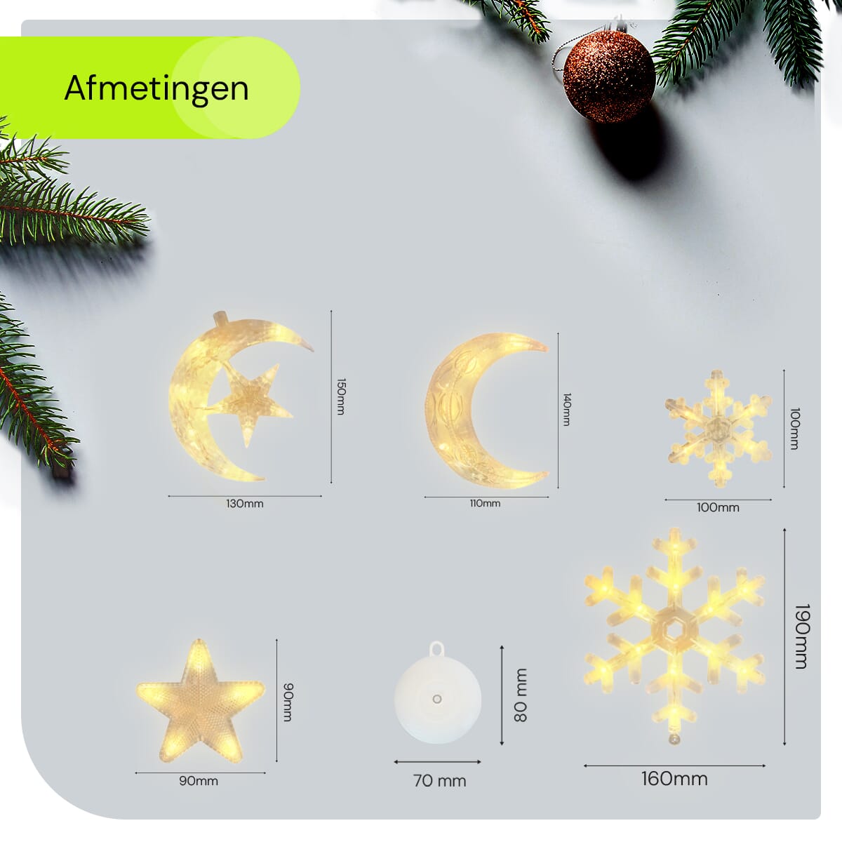 Kerstverlichting set voor het raam met halve maan, maan en sneeuwvlokken