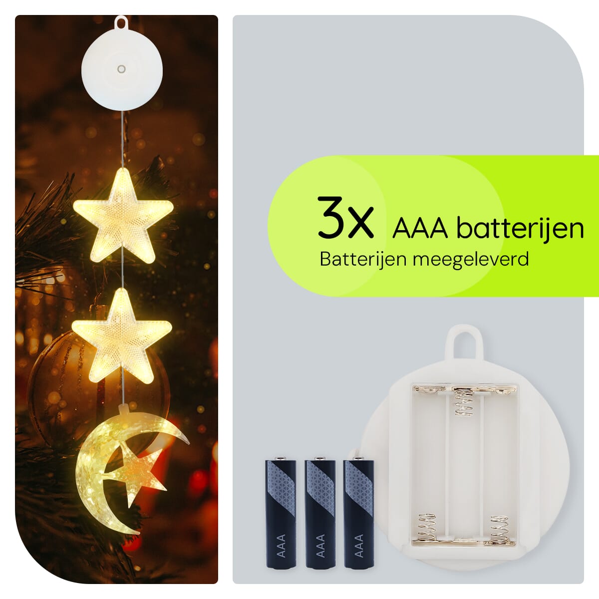 De Kerstverlichting Raam Halve Maan met Ster werkt op batterijen, waardoor je niet afhankelijk bent van stopcontacten. Dit maakt het eenvoudig om de verlichting overal in huis te plaatsen, zonder dat je je zorgen hoeft te maken over snoeren die in de weg zitten. Perfect voor een flexibele kerstversiering decoratie binnen.