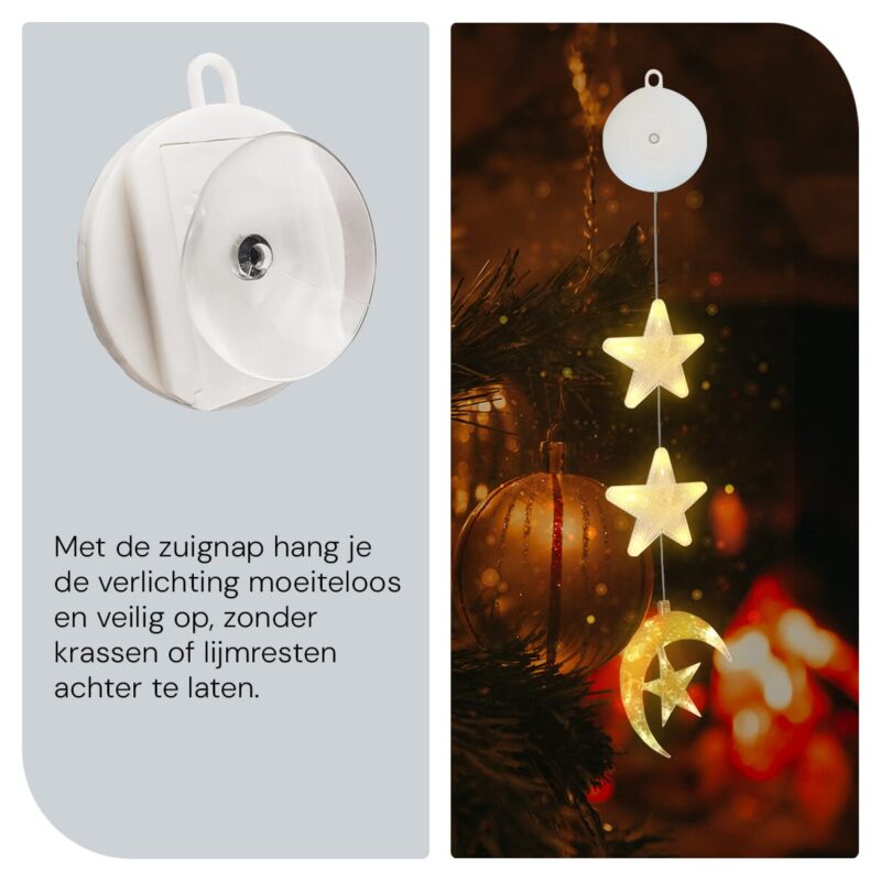 Met de meegeleverde zuignap is het bevestigen van de kerstverlichting aan je raam een fluitje van een cent. Geen gedoe met ingewikkelde installaties, gewoon de zuignap aan het raam bevestigen en je bent klaar om te genieten van een schitterende kerstdecoratie voor binnen.