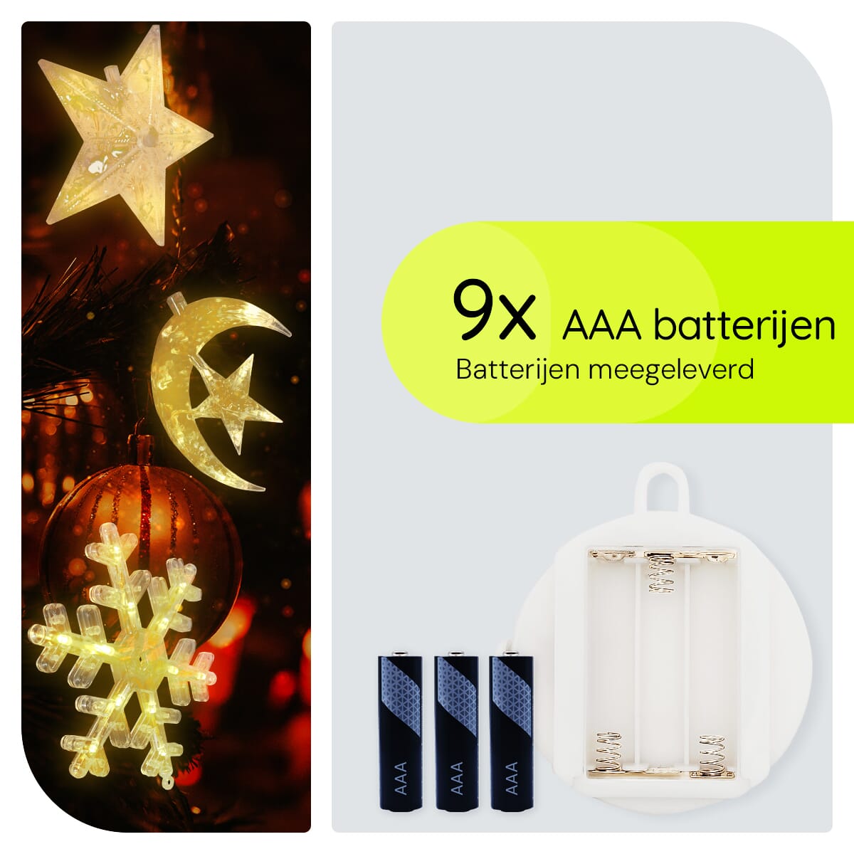 Geen stopcontact in de buurt? Geen probleem! Deze kerstverlichting werkt op batterijen, waardoor je ze overal kunt plaatsen waar je maar wilt. De set wordt geleverd met 9xAAA batterijen, zodat je meteen aan de slag kunt.