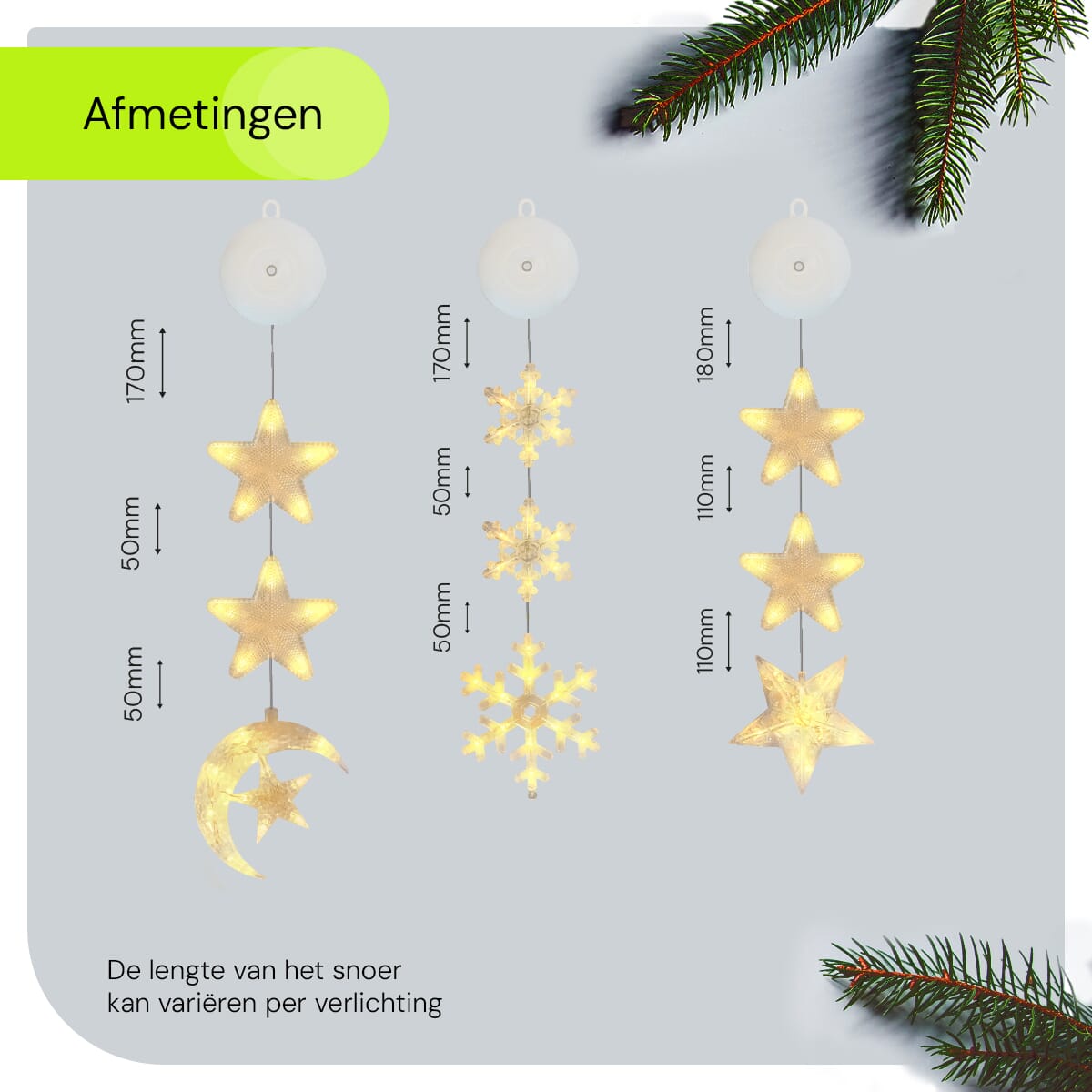 - Eenvoudige bevestiging: Dankzij de handige zuignappen bevestig je de kerstverlichting moeiteloos aan elk raam.