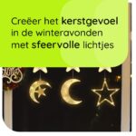 Breng de magie van de feestdagen naar je huis met deze betoverende set kerstverlichting. Deze unieke set van drie figuren – een halve maan, een ster en een maan – zorgt voor een warme en feestelijke sfeer in elke kamer. Perfect voor wie op zoek is naar prachtige kerstdecoratie voor binnen.
