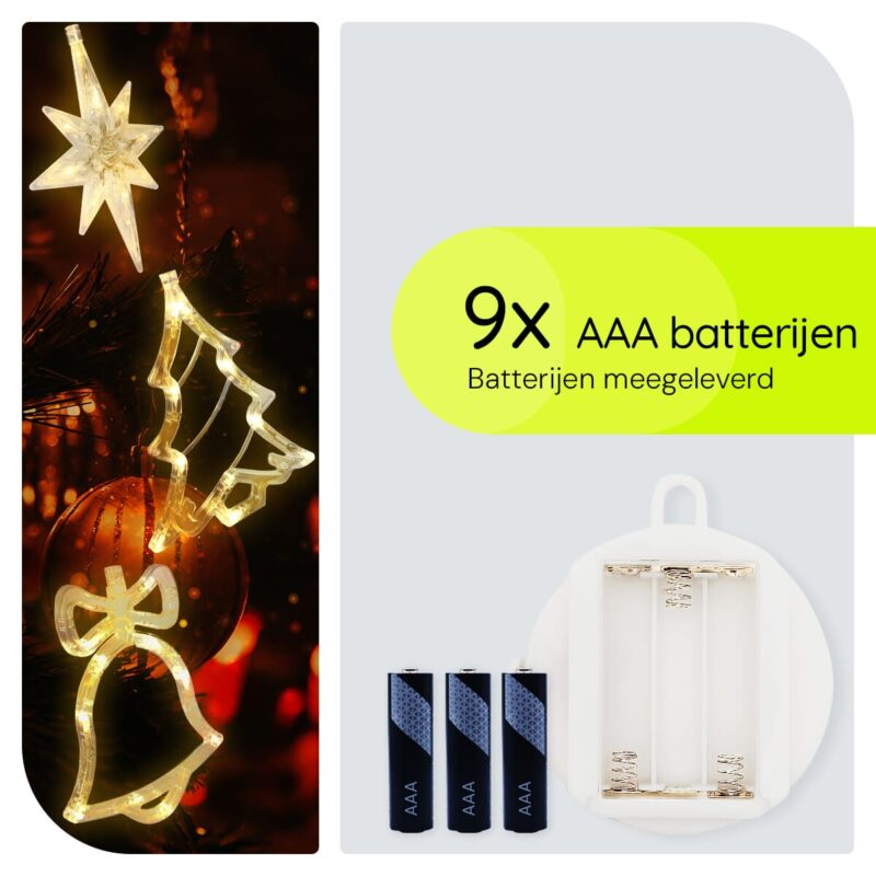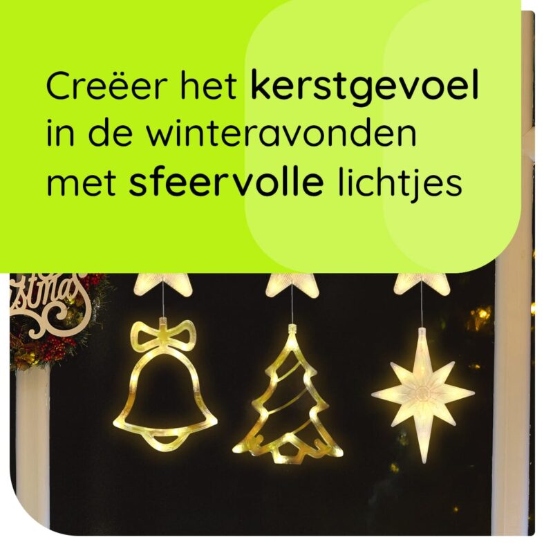 Kerstverlichting set voor het raam met kerstbel, kerstboom en noorderster