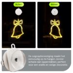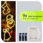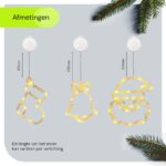 De set bestaat uit drie figuren: een kerstbel van 20×16 cm, een kerstman gezicht van 20×19 cm en een kerstsok van 16×16 cm. Elk figuur is voorzien van een zuignap en werkt op 3×3 AAA batterijen, die bij de set zijn inbegrepen. Hang ze eenvoudig op aan je raam en geniet van de feestelijke verlichting.