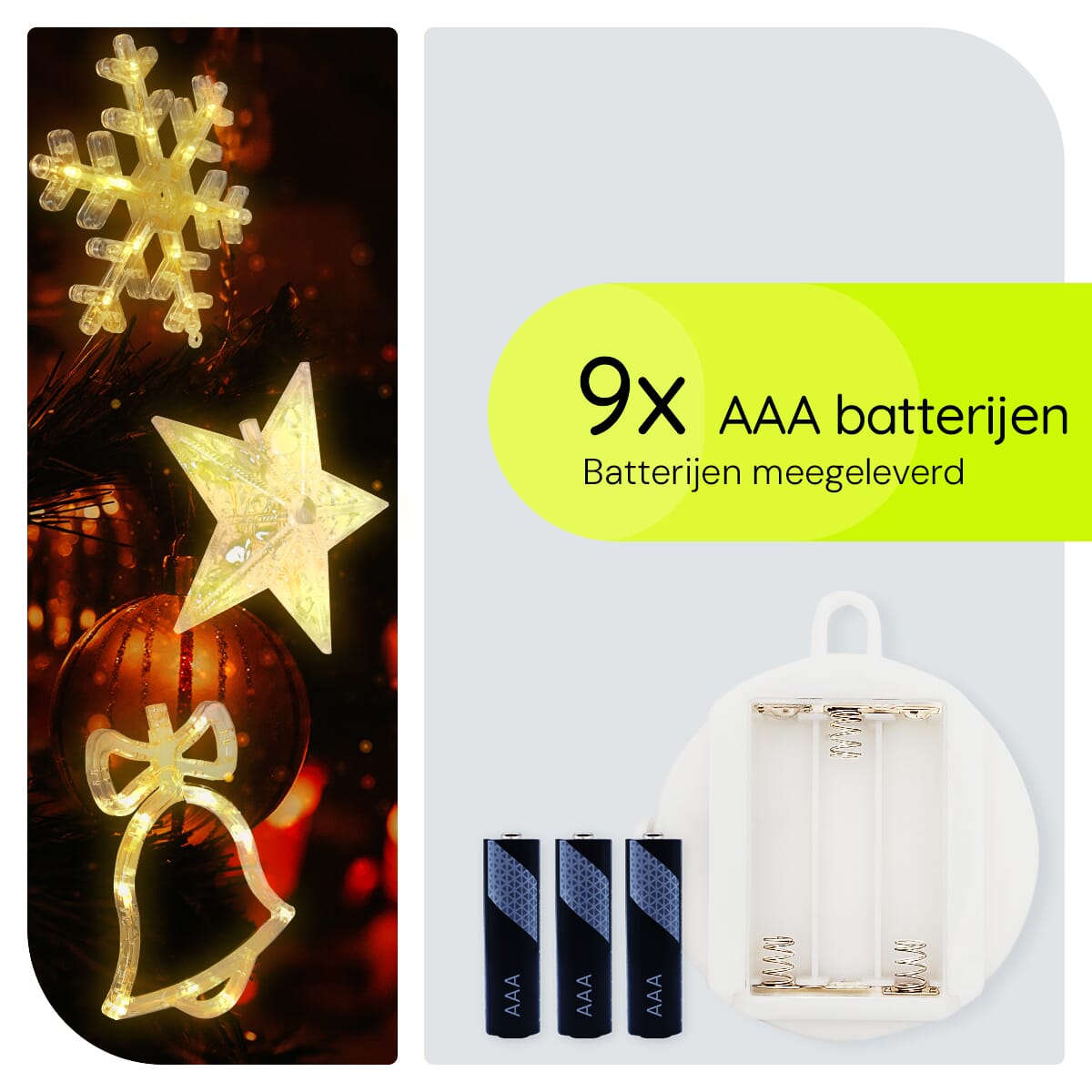 Kerstverlichting set voor het raam met sneeuwvlokken, sterren en kerstboom