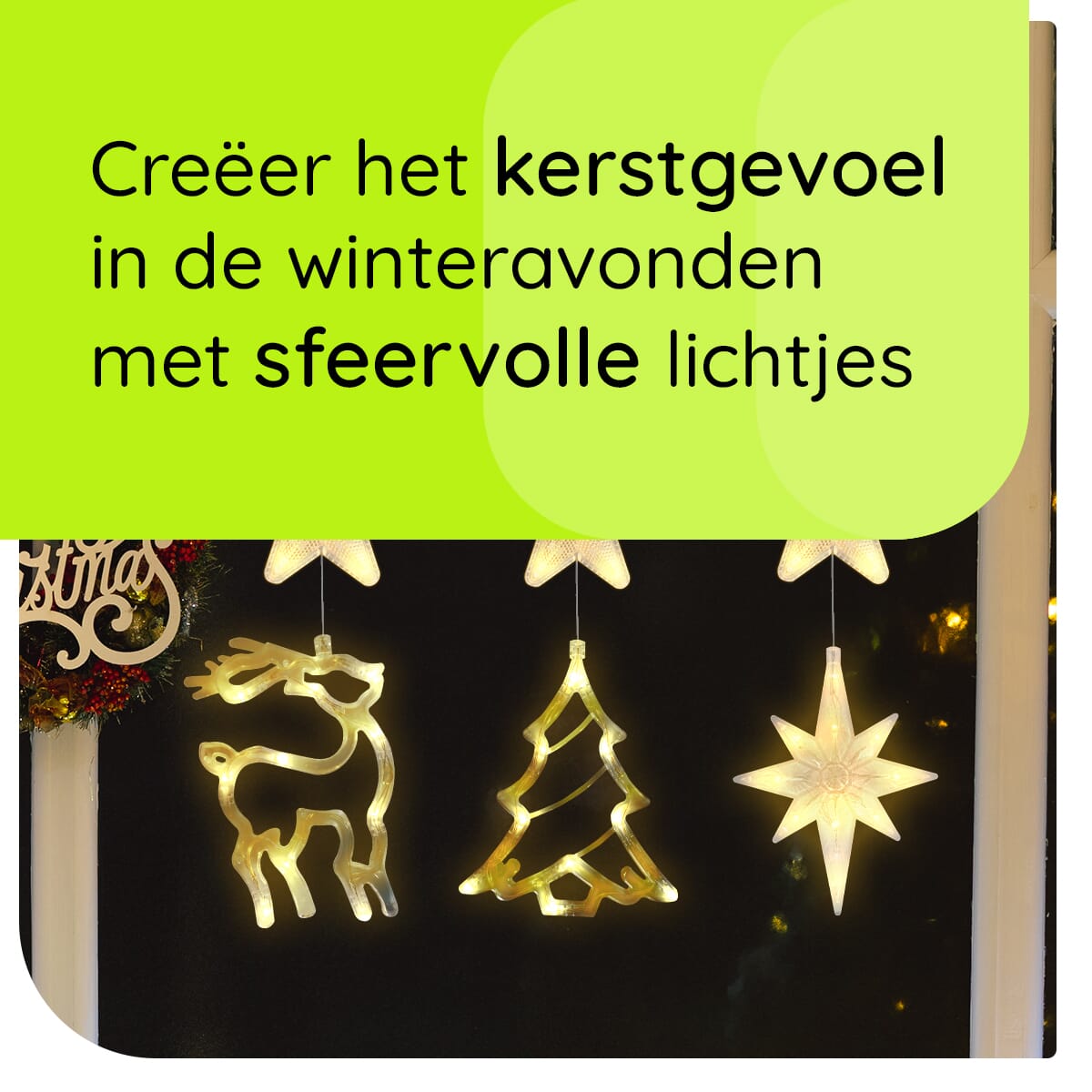 Kerstverlichting set voor het raam met kerstboom, noorderster en rendier