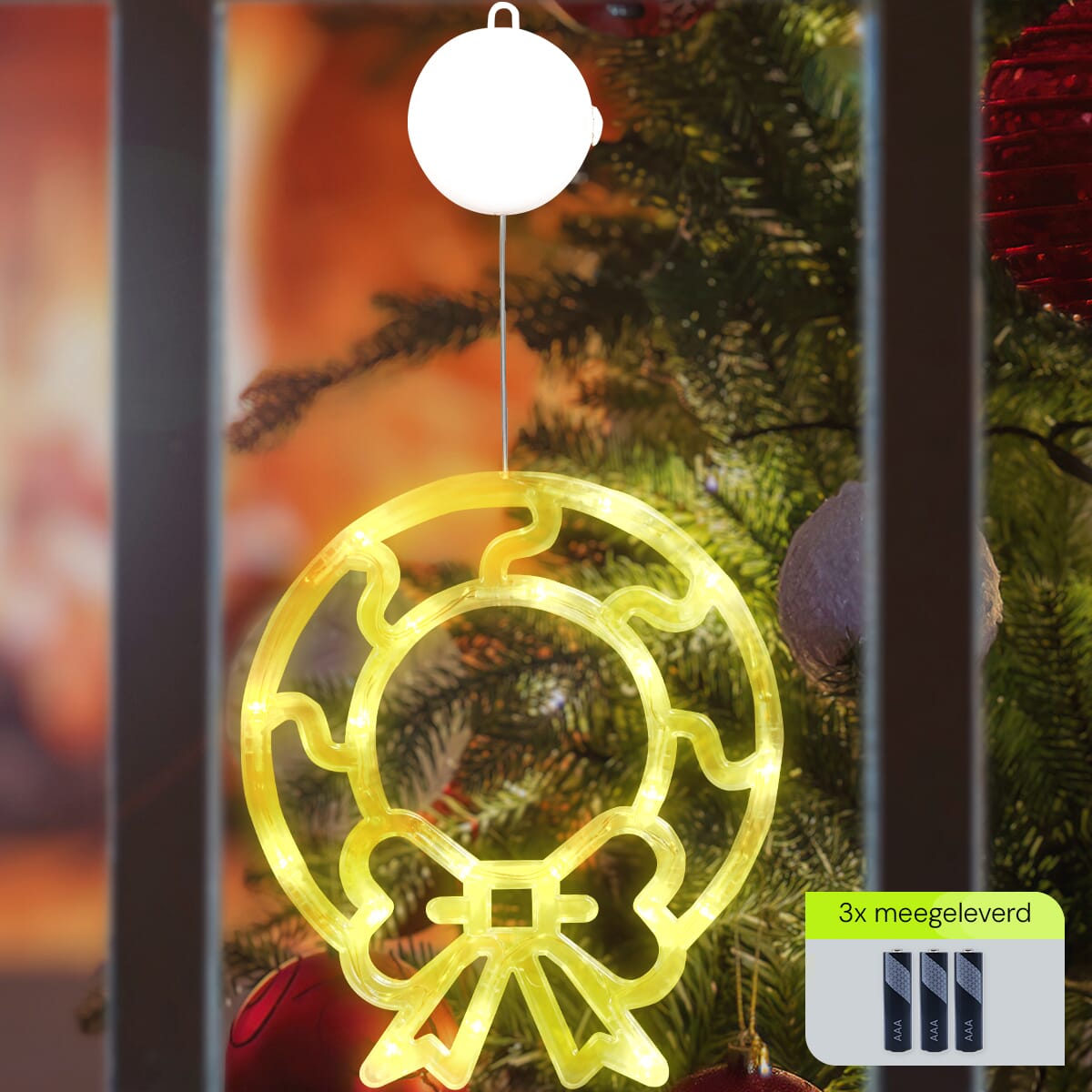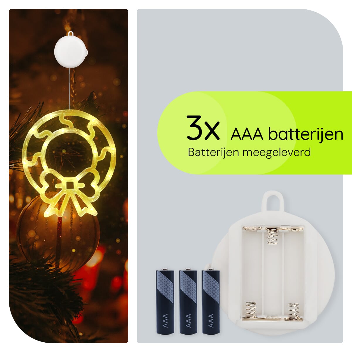 De kerstverlichting werkt op drie AAA-batterijen, waardoor je geen rekening hoeft te houden met stopcontacten of lastige snoeren. Dit maakt de raamdecoratie ideaal voor elke ruimte, zelfs als er geen elektriciteit in de buurt is.