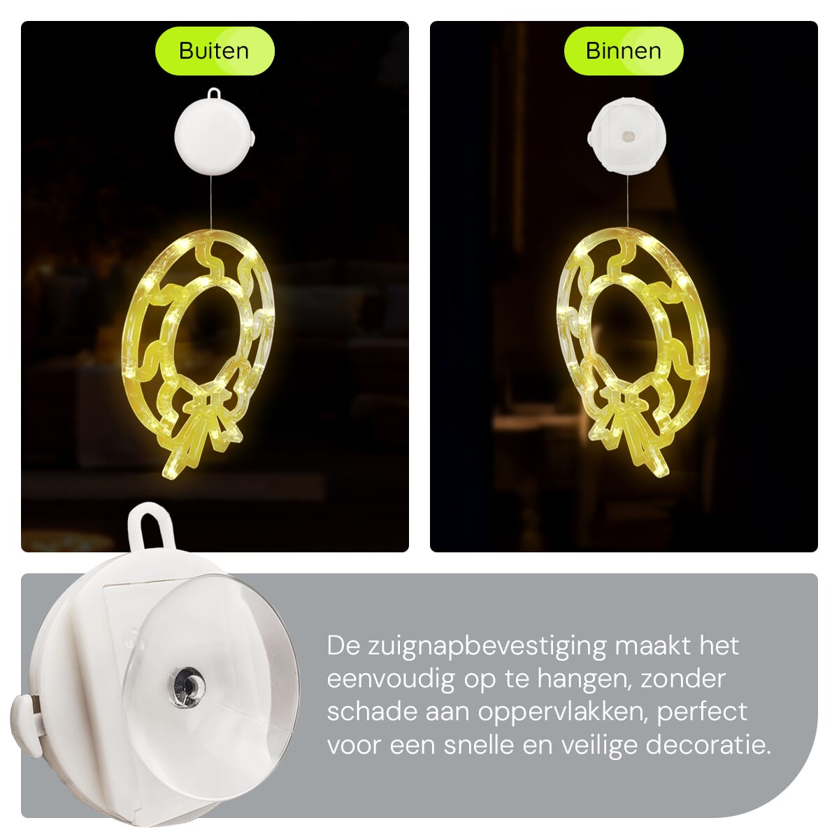 - Eenvoudige bevestiging: Dankzij de handige zuignap bevestig je de raamverlichting in een handomdraai aan je raam.