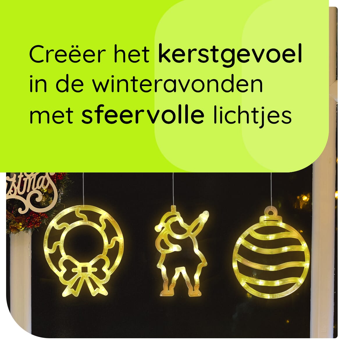 Breng de magie van Kerst naar je huis met onze prachtige kerstverlichting set. Deze unieke set van drie biedt een betoverende mix van een kerstkrans, kerstbal en een vrolijke kerstman, perfect voor het creëren van een feestelijke sfeer. Met deze verlichte raamdecoratie wordt jouw raam het stralende middelpunt van de straat.
