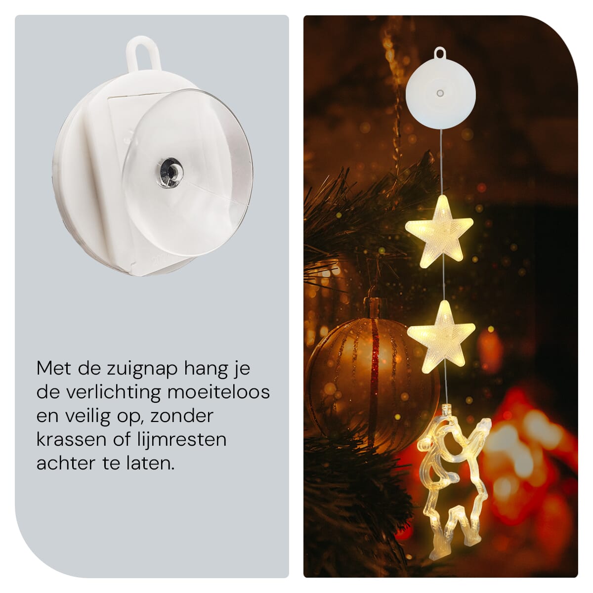Dankzij de slimme zuignap bevestig je deze kerstverlichting snel en stevig aan je raam. Geen gedoe met schroeven of lijm, maar simpelweg een kwestie van de zuignap aandrukken en je bent klaar. Ideaal voor iedereen die zijn kerstdecoratie voor binnen snel wil opzetten.