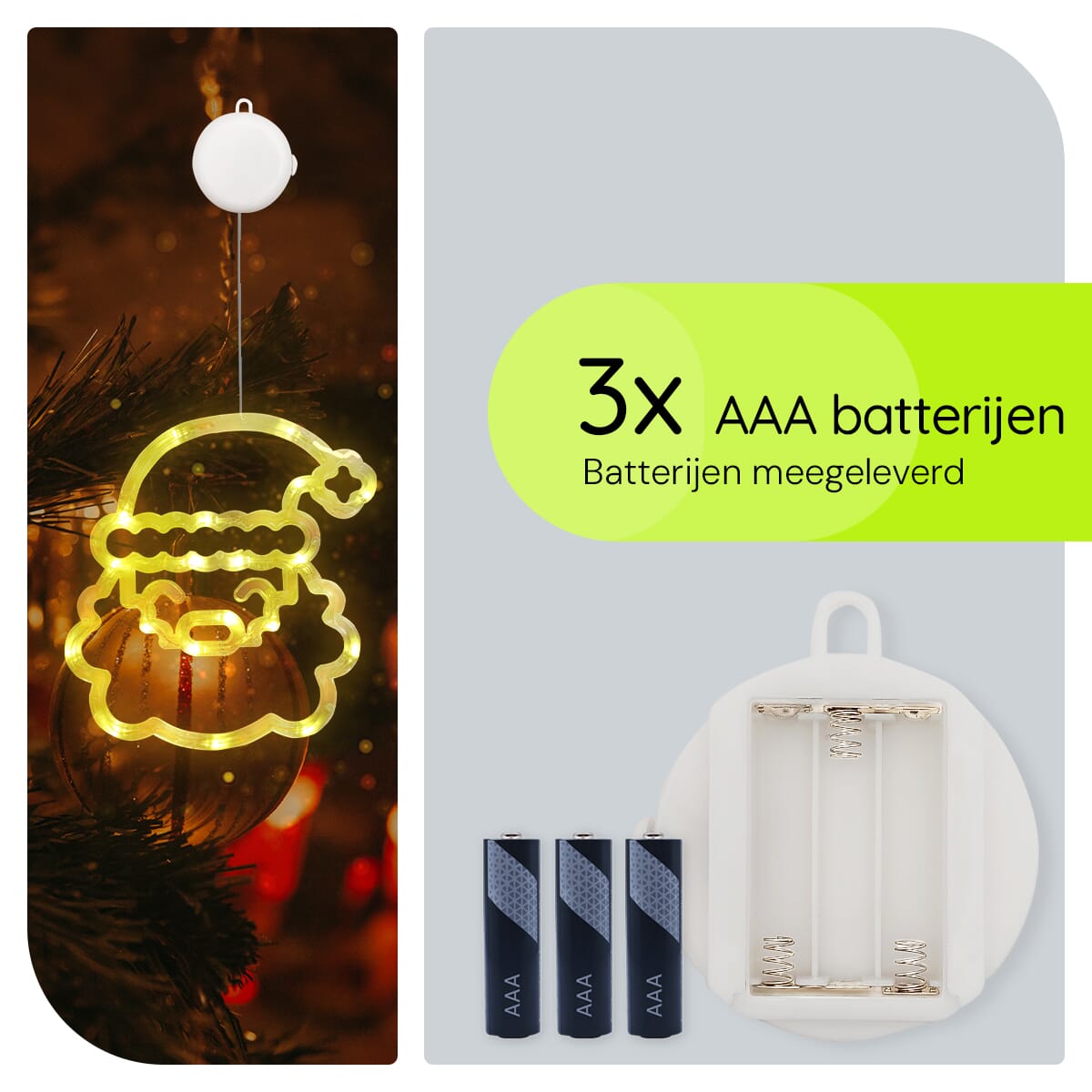 Plaats eenvoudigweg 3 AAA batterijen in het batterijcompartiment, bevestig de zuignap aan het raam en schakel de verlichting in. Een eenvoudig proces dat zorgt voor een sfeervolle kerstsfeer in enkele minuten.