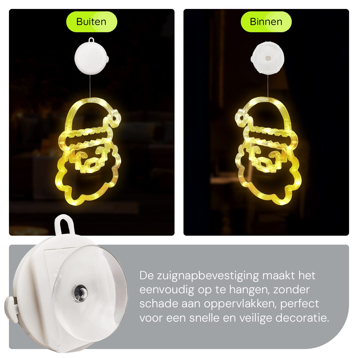 Met de handige zuignap bevestig je deze verlichte raamdecoratie eenvoudig aan je raam. Geen gedoe met draden of lastige installaties. Gewoon de zuignap vastmaken, en je bent klaar om te genieten van een sfeervolle kerstversiering.