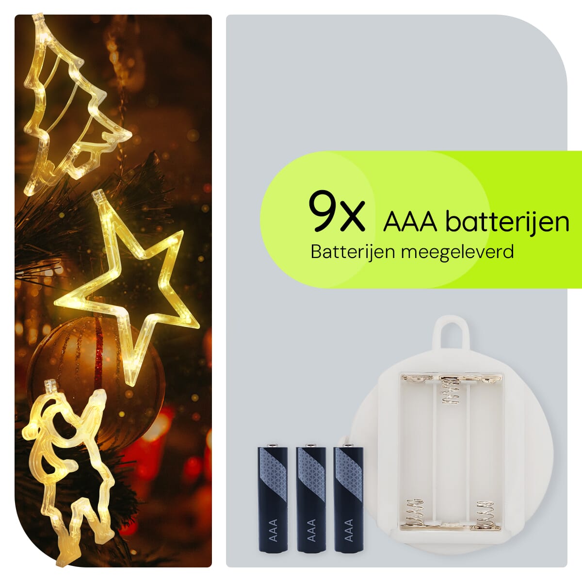 Deze raamverlichting werkt eenvoudig met een koordje en zuignap. Plaats de batterijen, bevestig de zuignap op het raam, en geniet van een stralende kerstverlichting. Dankzij de zuignap is het verplaatsen en verwijderen van de decoratie een fluitje van een cent.