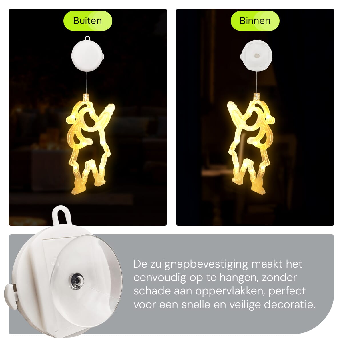 Met de inbegrepen zuignap bevestig je deze sfeervolle kerstversiering eenvoudig op elk raam. Geen gereedschap nodig, en je kunt hem ook gemakkelijk verplaatsen of verwijderen wanneer je maar wilt.