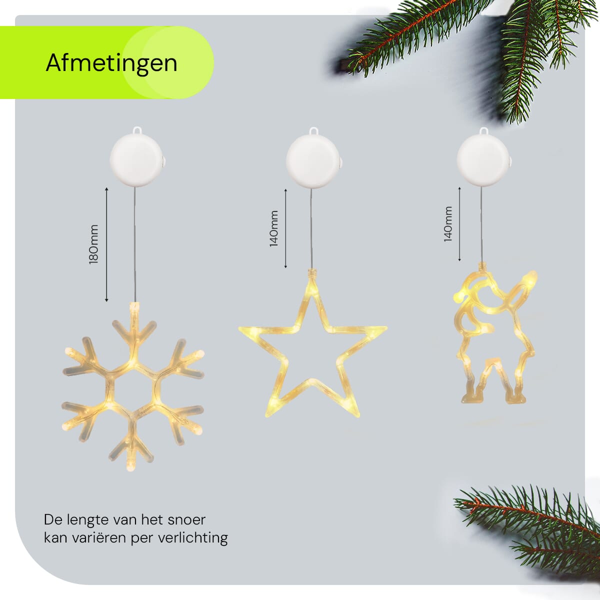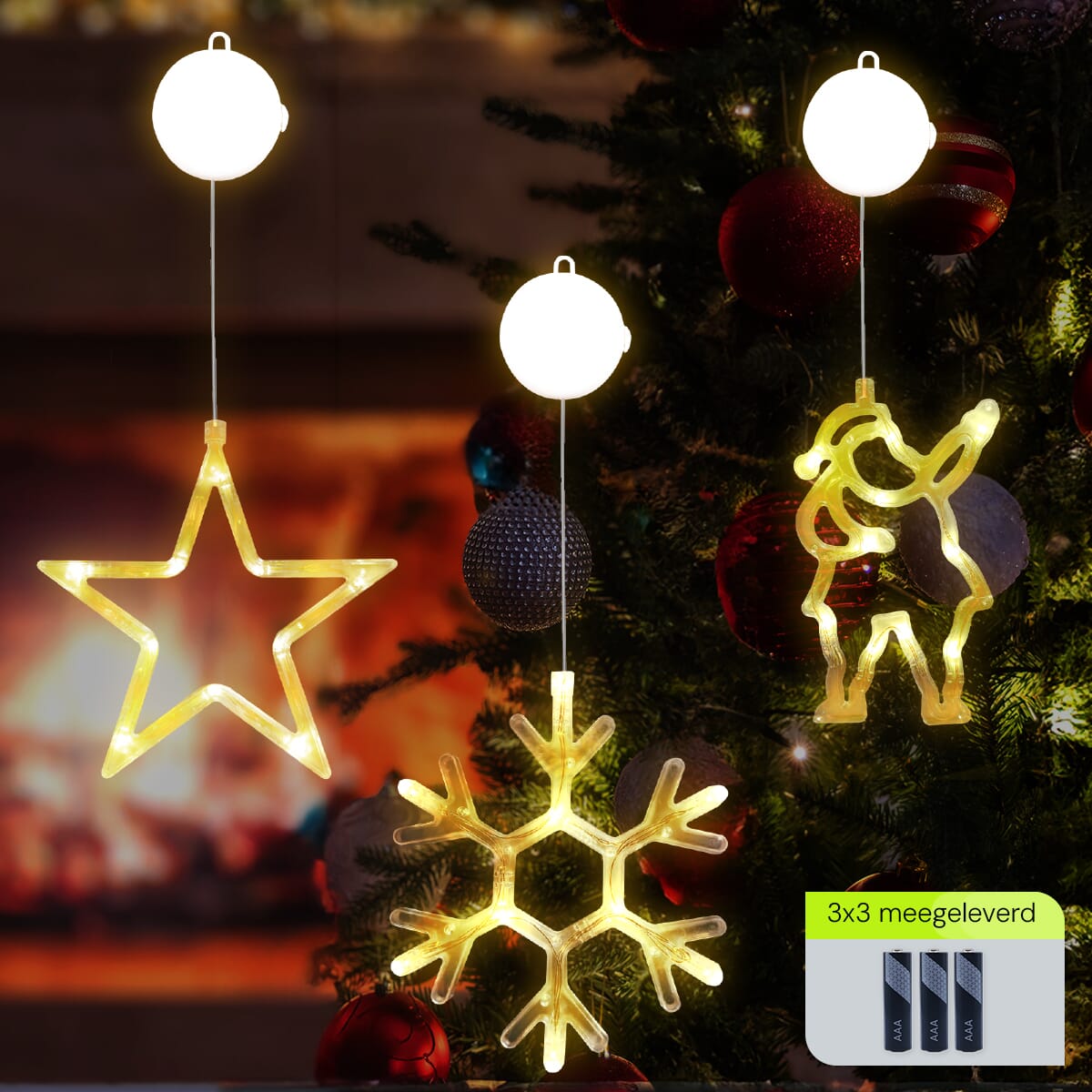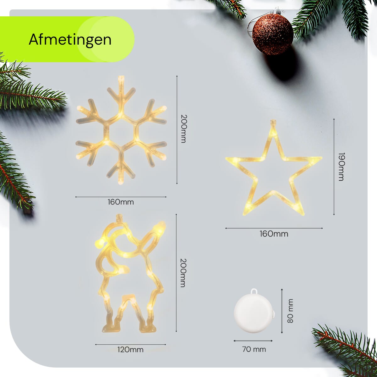 De kerstverlichting werkt op drie sets van drie AAA-batterijen, waardoor je ze flexibel kunt plaatsen zonder afhankelijk te zijn van stopcontacten. Ideaal voor ramen op moeilijk bereikbare plekken.