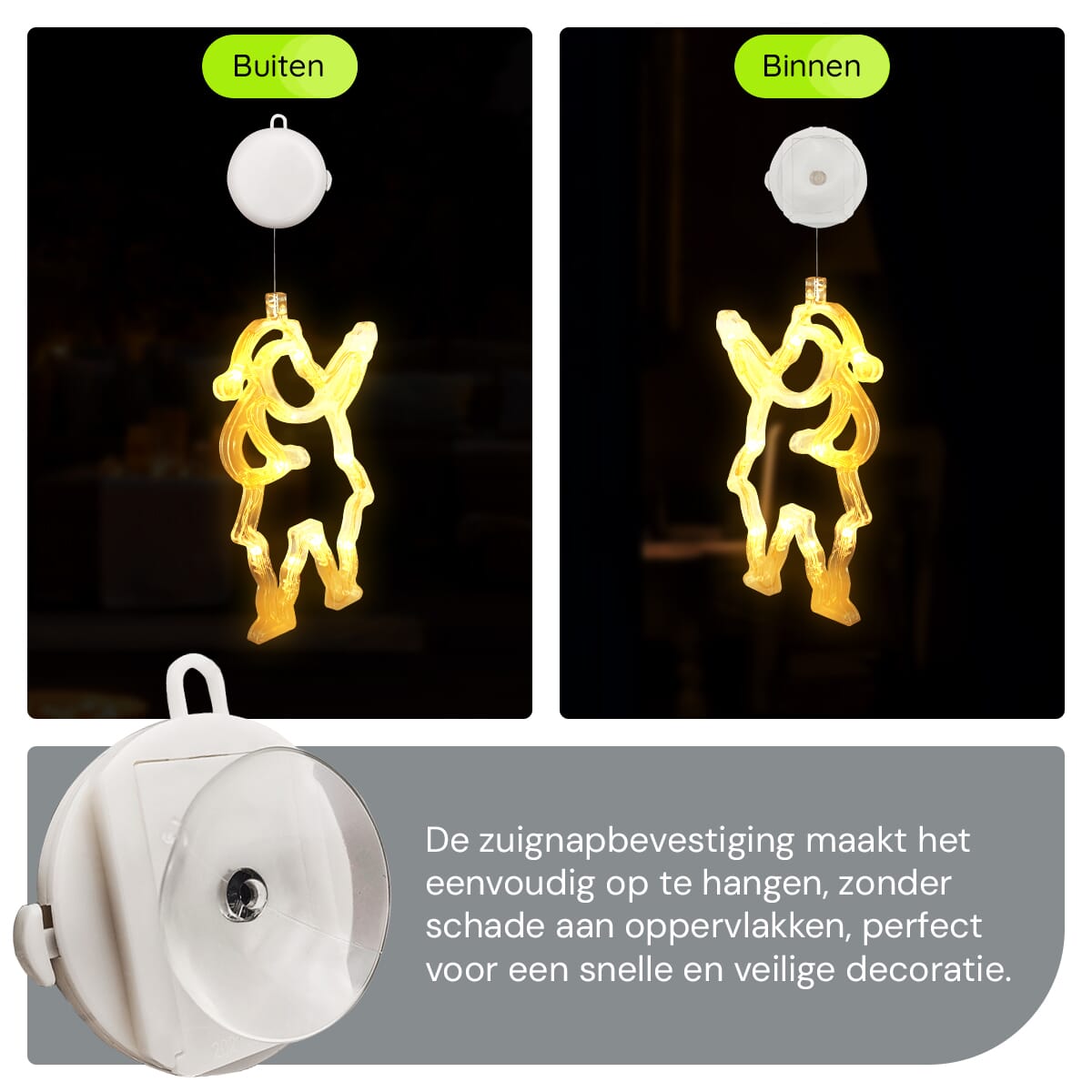 - Eenvoudige bevestiging: Dankzij de handige zuignappen zijn deze verlichte raamdecoraties in een mum van tijd opgehangen.