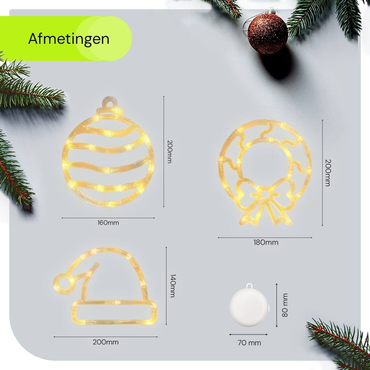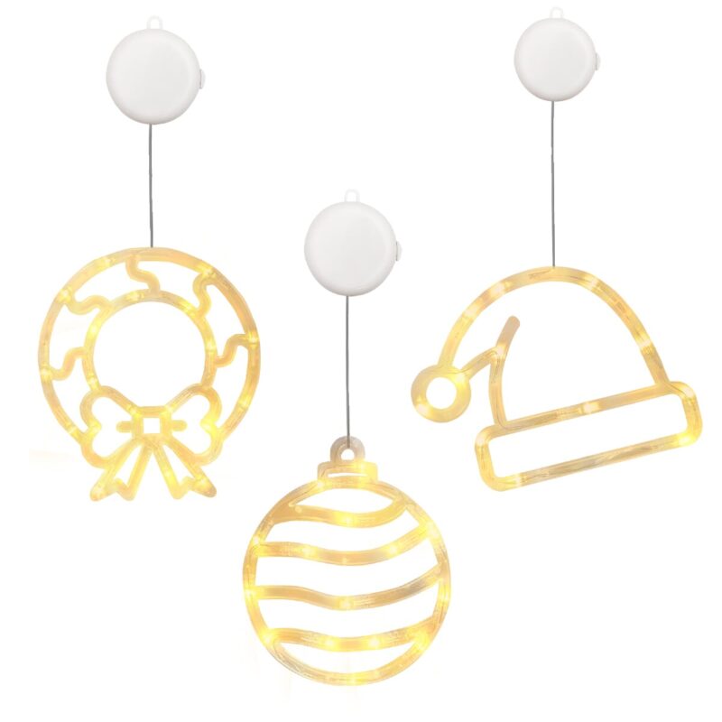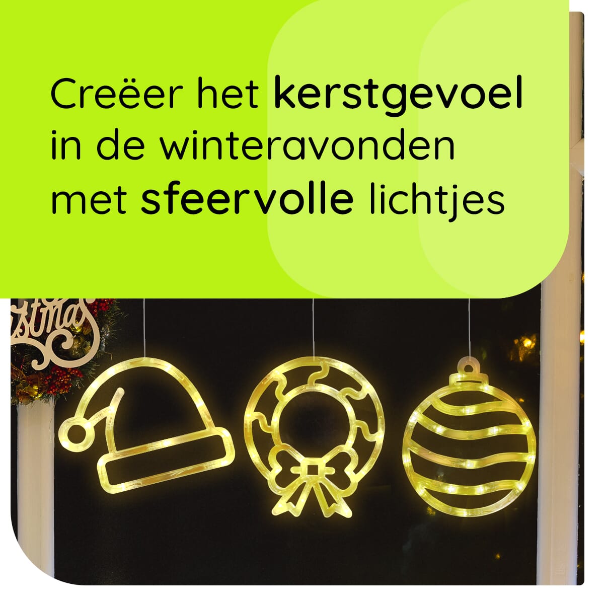 Tover je huis om tot een magisch kersttafereel met onze sfeervolle kerstverlichting voor het raam. Deze set van drie vrolijke kerstfiguren brengt direct warmte en gezelligheid in je huis tijdens de feestdagen. Of je nu kiest voor de kerstmuts, de kerstkrans of de kerstbal, elk stuk is ontworpen om je raam op een unieke manier te verlichten.