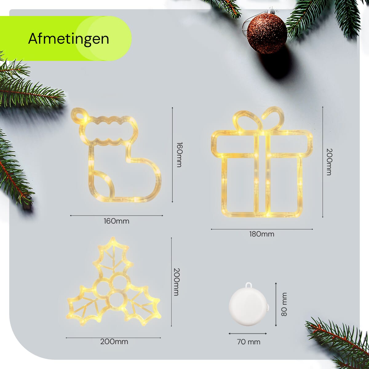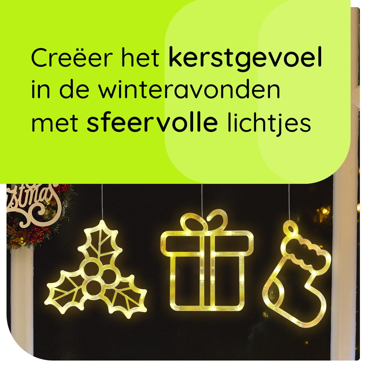 Deze set van drie verlichte raamdecoraties bestaat uit een kerstsok van 16x16cm, een kerstcadeau van 20x18cm en een mistletoe van 20x20cm. Elke figuur is zorgvuldig ontworpen om je raam een vrolijke en feestelijke uitstraling te geven, perfect passend bij de warme kerstsfeer.