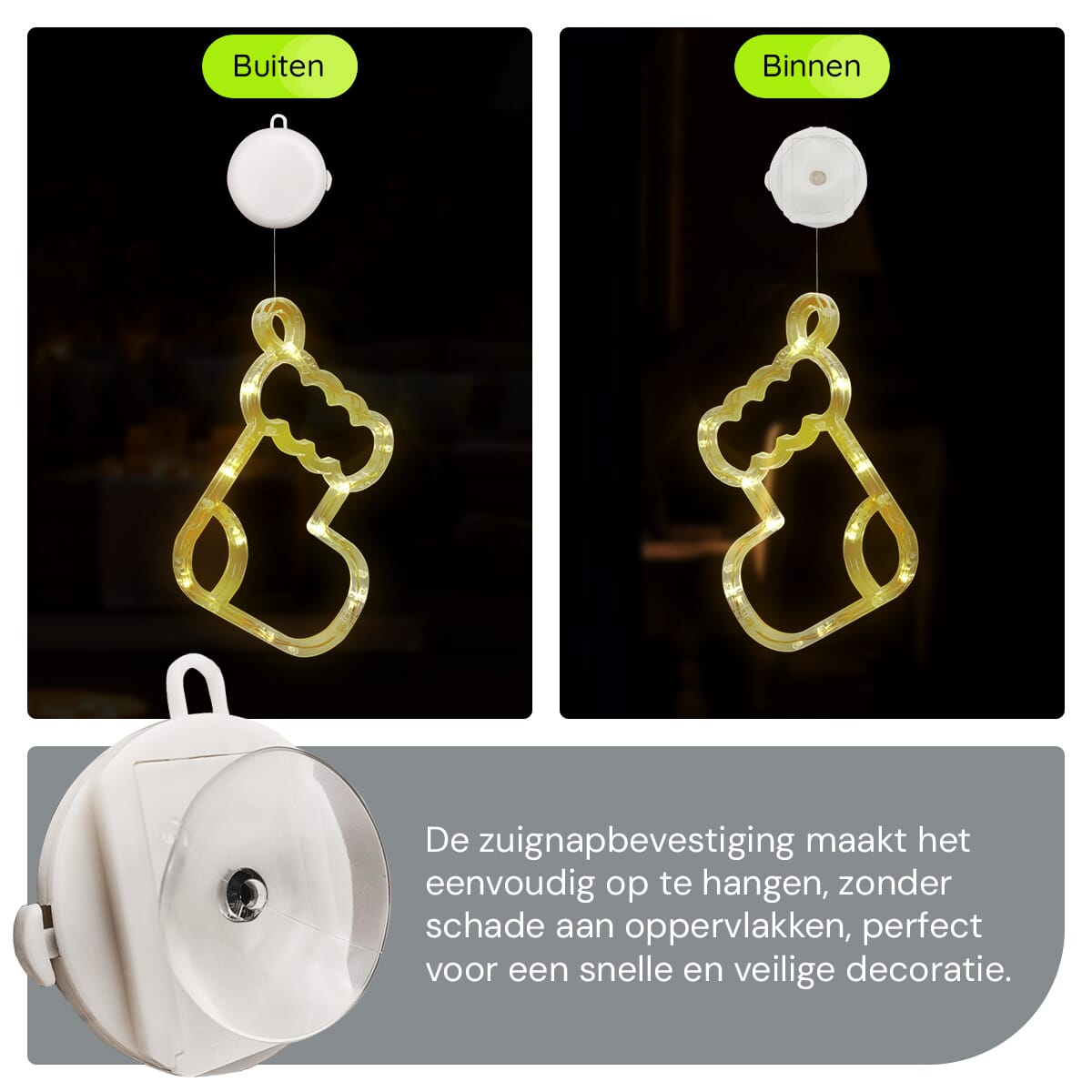 Speelse Kerstsok: Met een afmeting van 16x16cm brengt deze verlichte kerstsok een speelse en vrolijke sfeer naar je raam. De warme verlichting zorgt voor een gezellige uitstraling die perfect past bij de feestdagen.