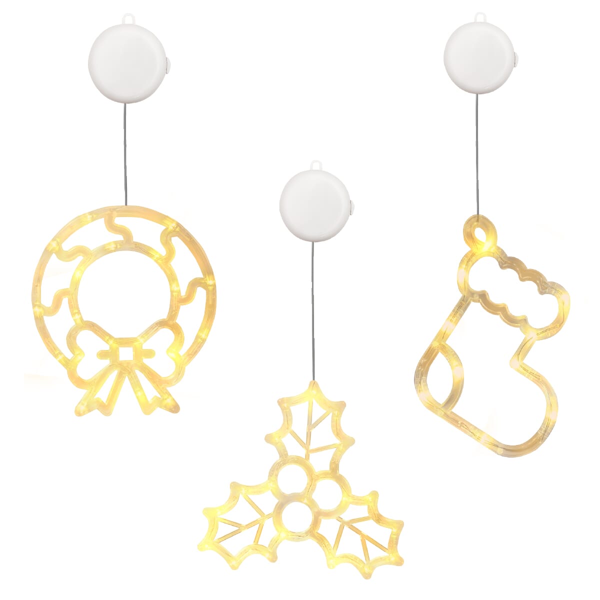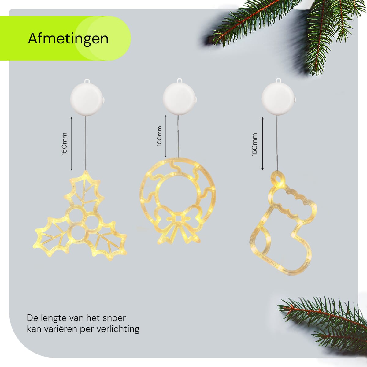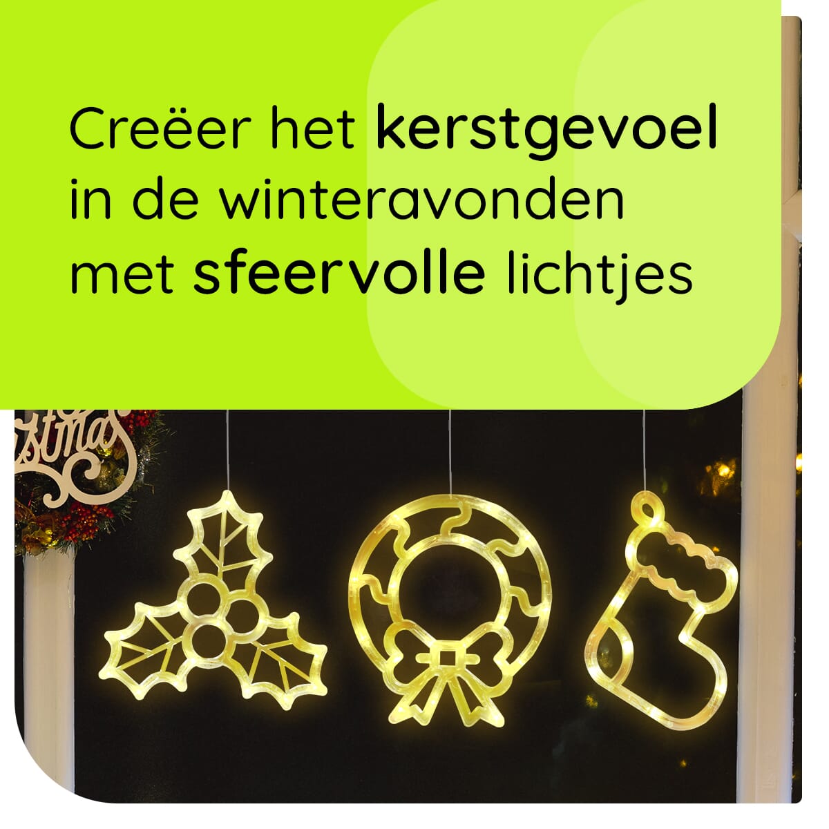 Breng de magie van Kerst naar je huis met deze prachtige verlichte raamdecoraties. Perfect voor het creëren van een warme en feestelijke sfeer, deze set van drie vrolijke kerstversieringen brengt gegarandeerd een glimlach op ieders gezicht. Hang ze eenvoudig op met de handige zuignap en geniet van de betoverende uitstraling van je raamdecoratie.