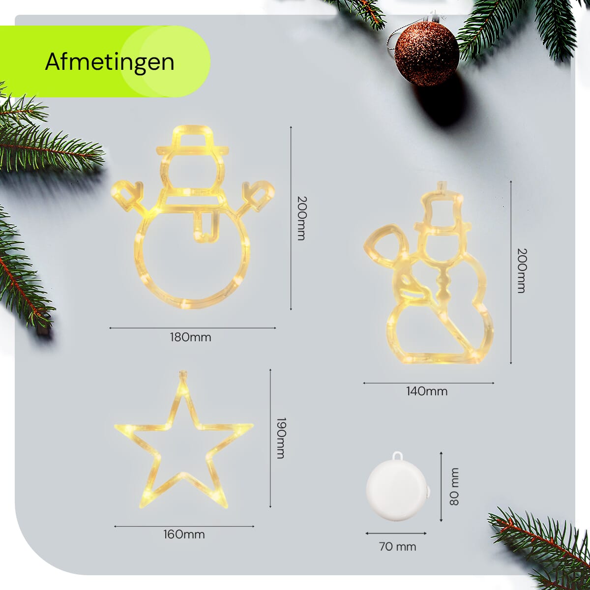 Breng de magie van Kerstmis naar je ramen met deze prachtige verlichte raamdecoratie set. Deze vrolijke kerstversiering bestaat uit een stralende kerstster en twee charmante sneeuwpoppen, die je huis een feestelijke uitstraling geven. Perfect voor iedereen die zijn ramen wil omtoveren tot een winter wonderland.